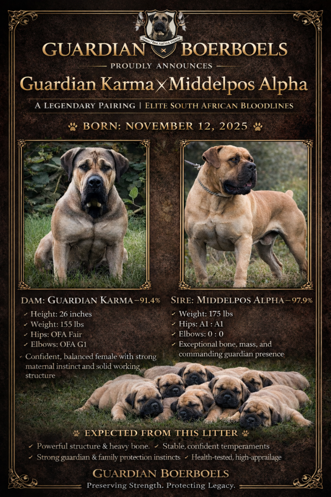 This highly selective pairing represents Guardian Boerboels’ commitment to correct type, structural integrity, and stable, confident guardian temperament—produced through the intentional preservation and use of Middelpos Alpha’s genetics.